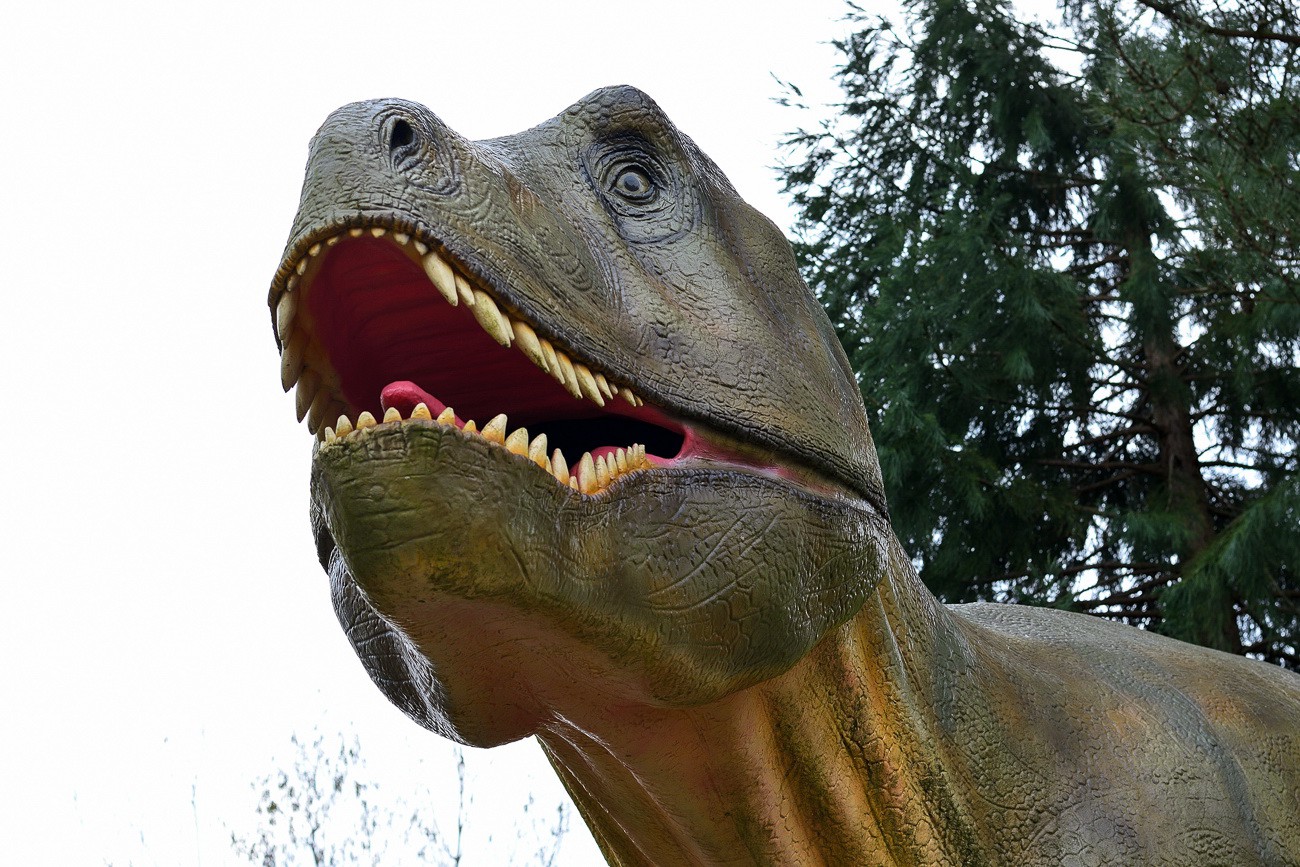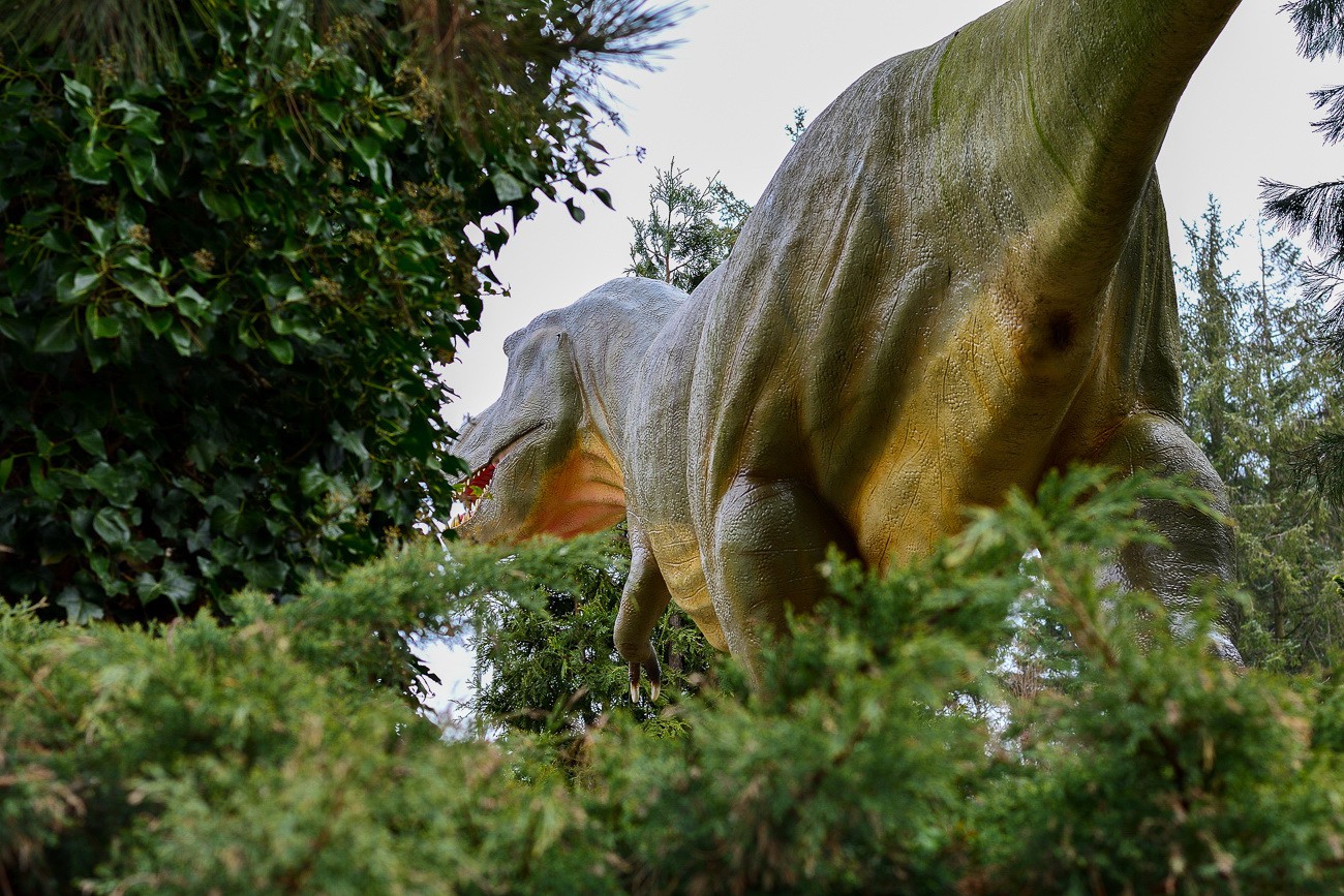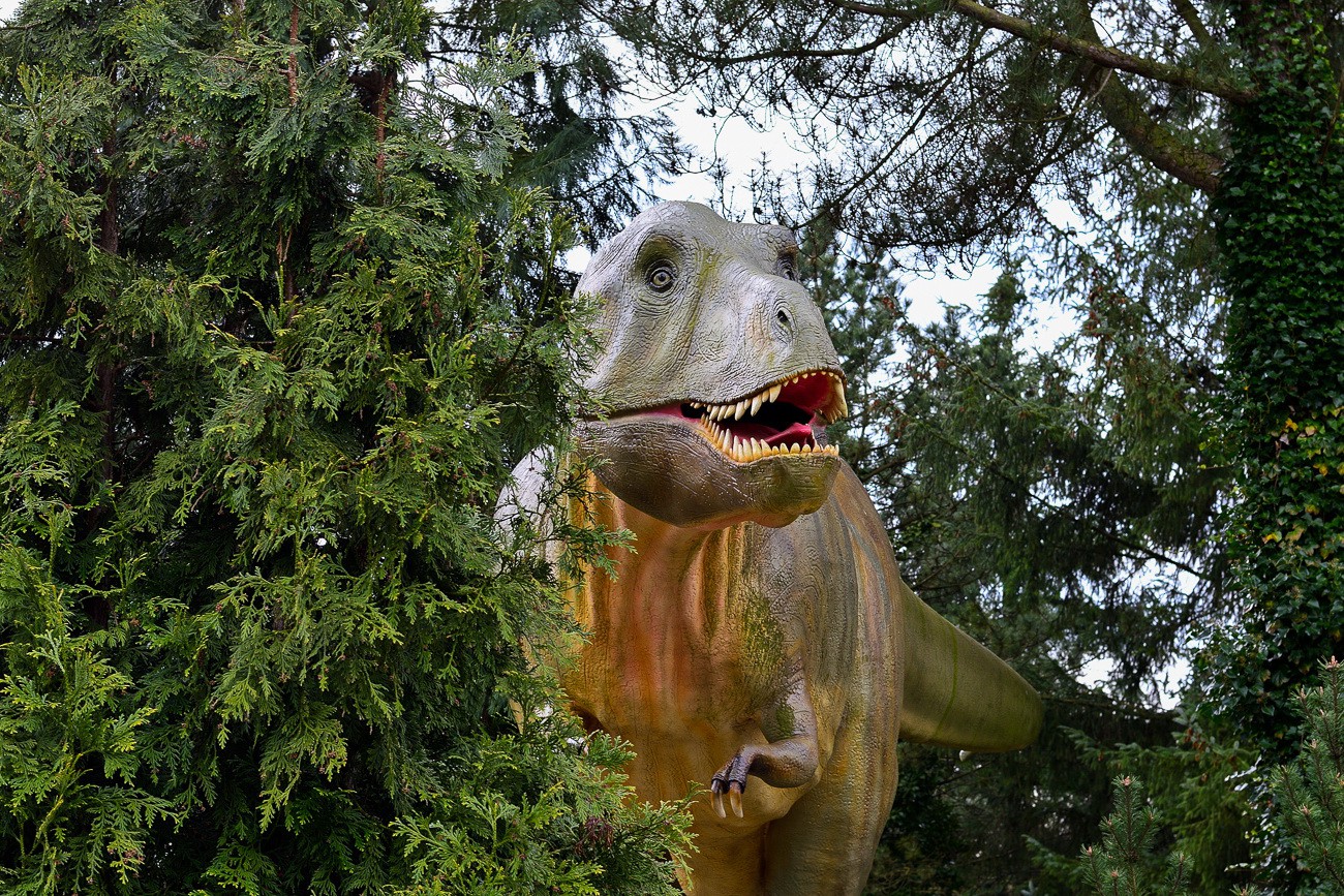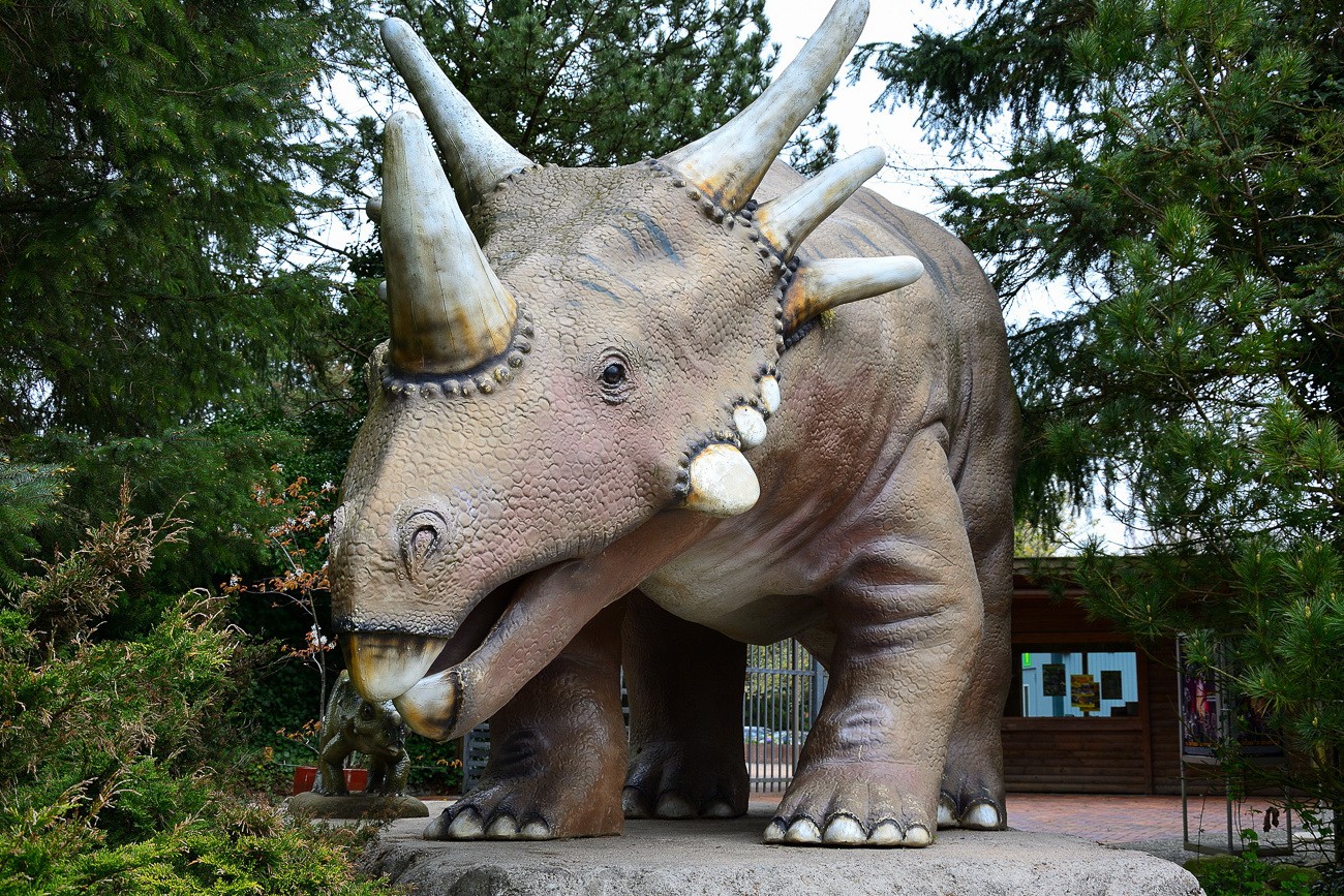 Bilder vom Dinosaurier, der vor dem Eingang der Tolk-Schau steht, aufgenommen 2017. Die Tolk-Schau ist ein Freizeitpark in Tolk bei Schleswig, der Park richtet sichh hauptsächlich an Familien mit Kindern bis elf Jahren und bietet über 100 Spiel- und Spaßmöglichkeiten auf einem weiträumigen Naturareal. Zu den Attraktionen gehören unter anderem eine Achterbahn, die Berg- und Talbahn, der Autoscooter und das Tal der Dinosaurier.